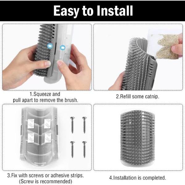 Pagrindas pagamintas iš patvaraus ABS plastiko ir turi minkštenius šerelius. Šukos švelniai masažuoja ir prižiūri katės kailiuką, nesukeldamos diskomforto ir nebraižydamos katės odos.