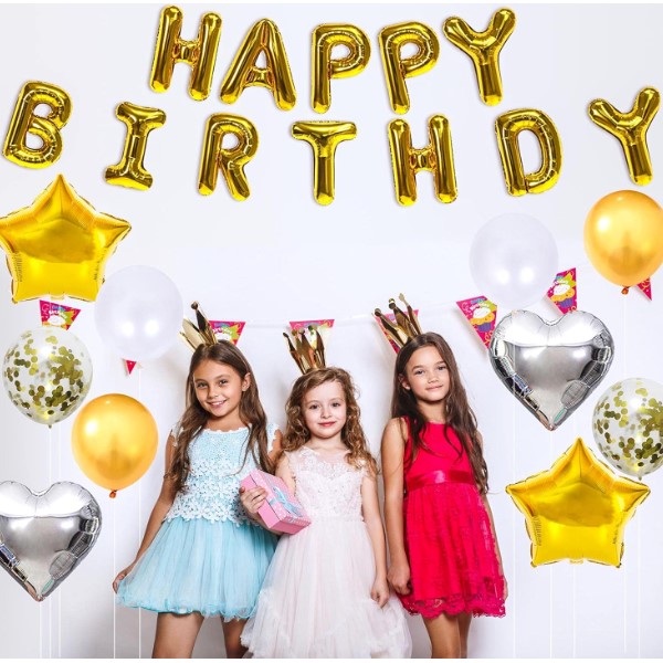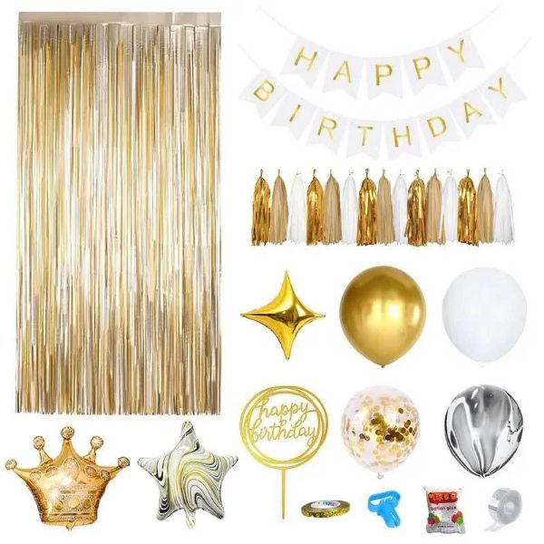 60 įvairių spalvų balionų; 1x karūnos formos balionas; 2x penkiakampės žvaigždės formos balionai; 2x keturkampės žvaigždės formos balionai; 1x užuolaida iš blizgančių kaspinų; 1x laimingo gimtadienio vėliava; 5x spalvingų dekoratyvinių kutukų rinkinys; 1x laimingo gimtadienio torto dekoracija; dekoratyvinė juostelė, balionų rišimo reikmenys, klijai ir balionų tvirtinimo juosta.