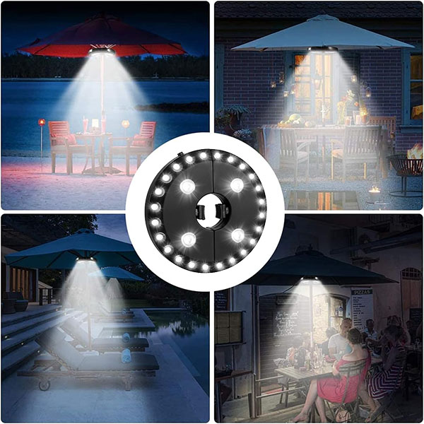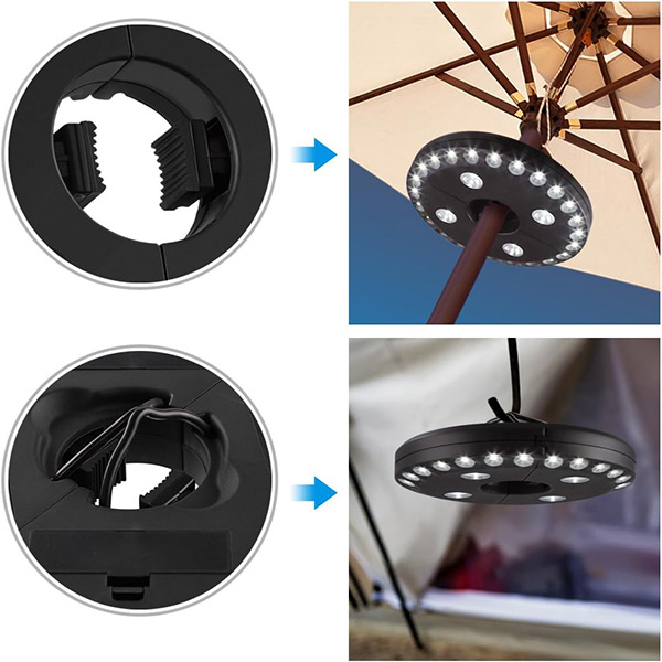 Skirtingai nei standartinės skėčio šviesos, BRELLAGLO veikia ten, kur jums reikia. Prisekite prie skėčio terasos apšvietimui arba naudokite įmontuotus kabliukus pakabinimui—puikiai tinka stovyklavimui ir lauko nuotykiams.
